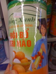 This drink mix contains only egg yolk and powered milk and costs nearly 5 USD for a small can. It’s being marketed directly to Vietnamese consumers who prize education achievements among many other things and especially for their children and grandchildren, hence the use of a young woman in the design.