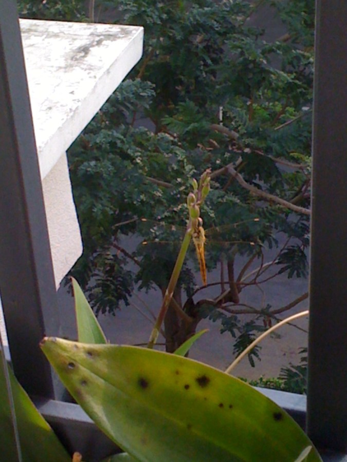 Early morning on a Sunday – dragonfly perched on the end of an orchid on our balcony.