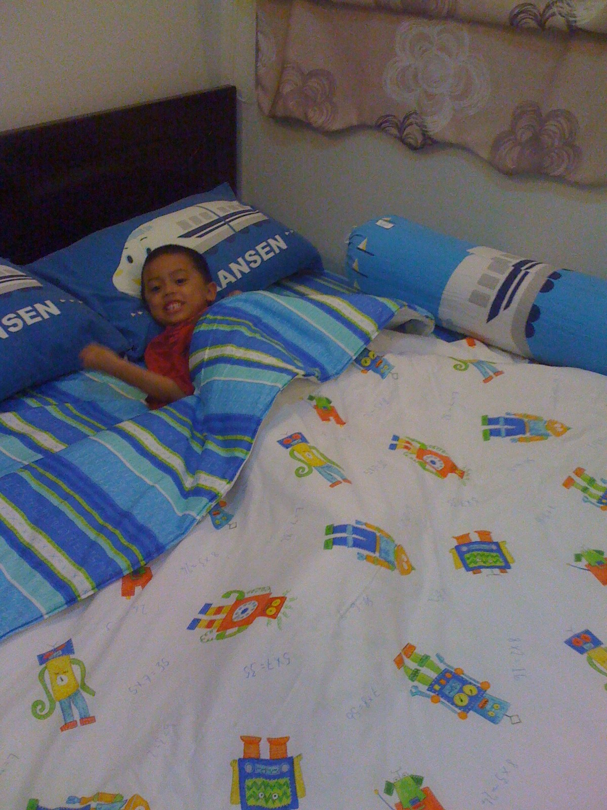 This is a shot of Jacob with his new robot and math sheets and blanket. He was super excited to have robots on the blanket.