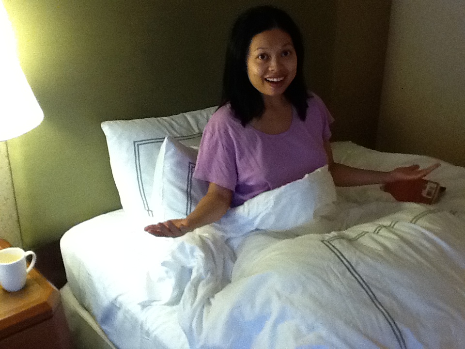 Bi in her comfy bed (really important for the pregnant lady!) with her book and hot tea nearby.
