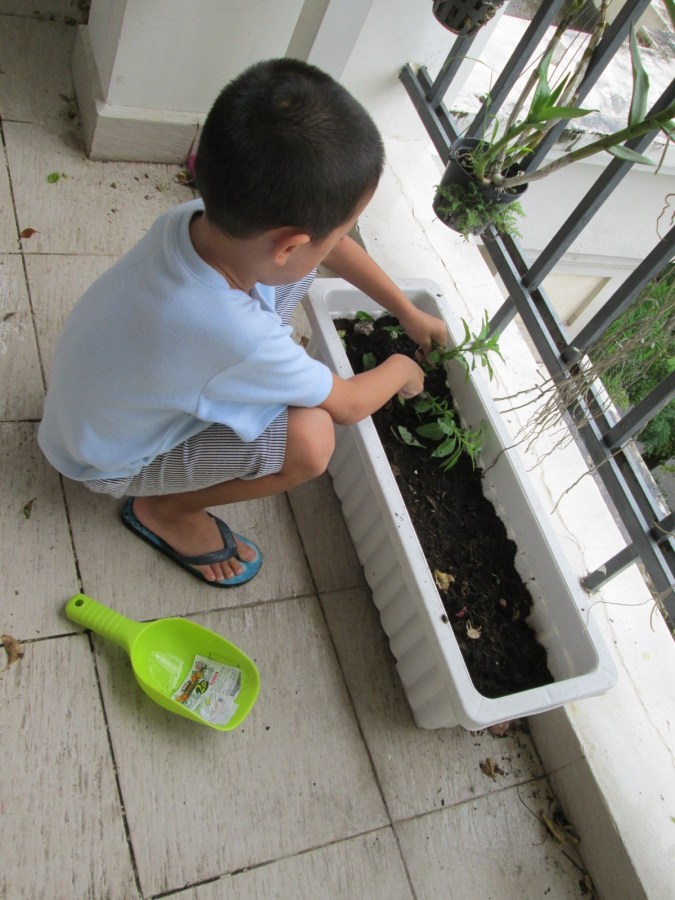 Jacob pulling weeds before planting his Aster seeds.