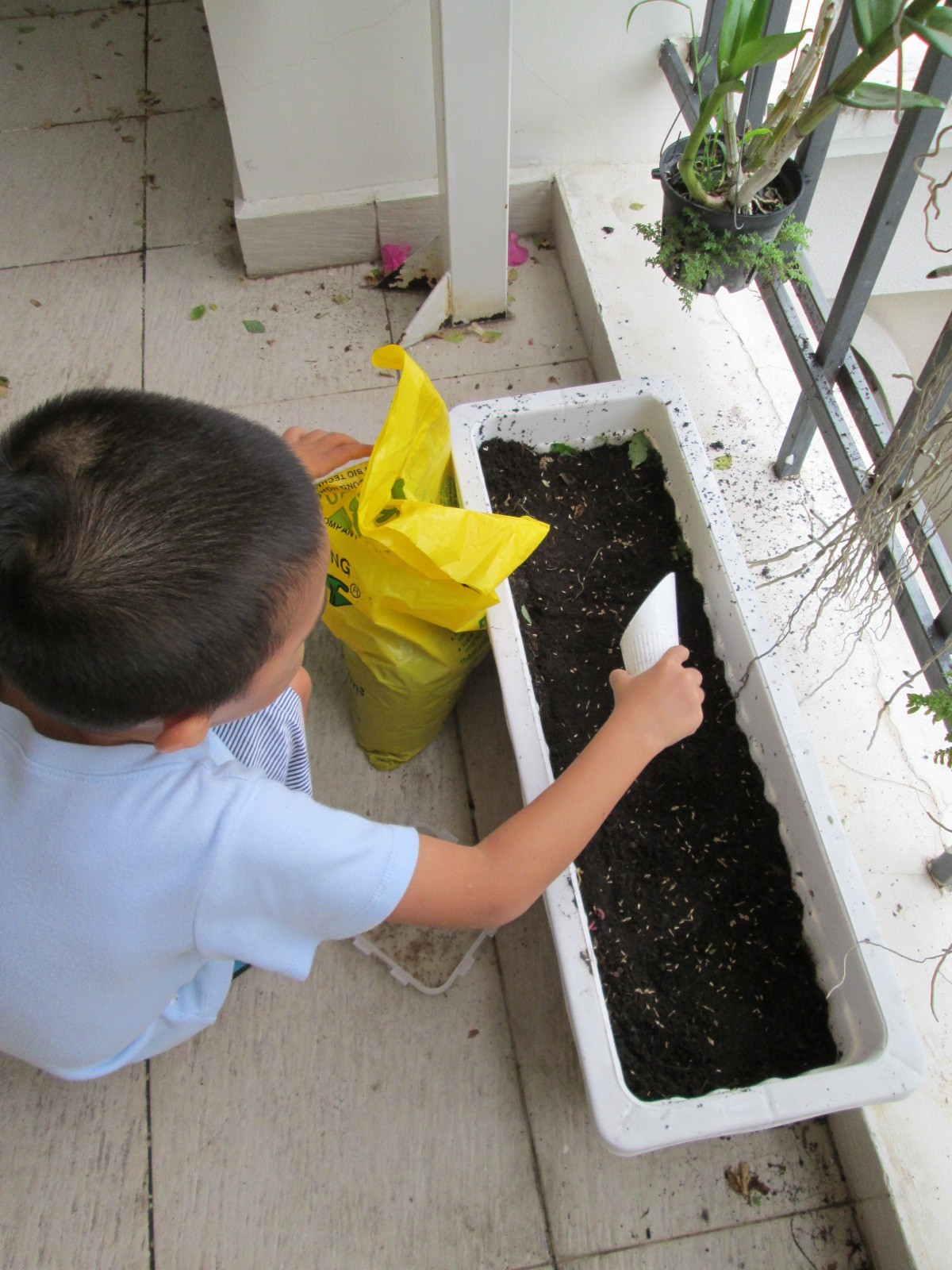 Jacob putting soil over his freshly planted Aster seeds.