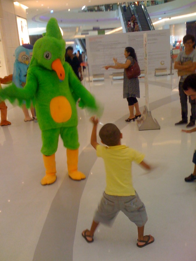 Jacob dancing with a giant bird in the local shopping mall.