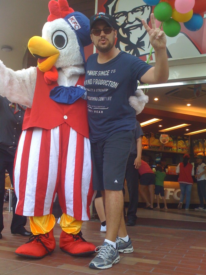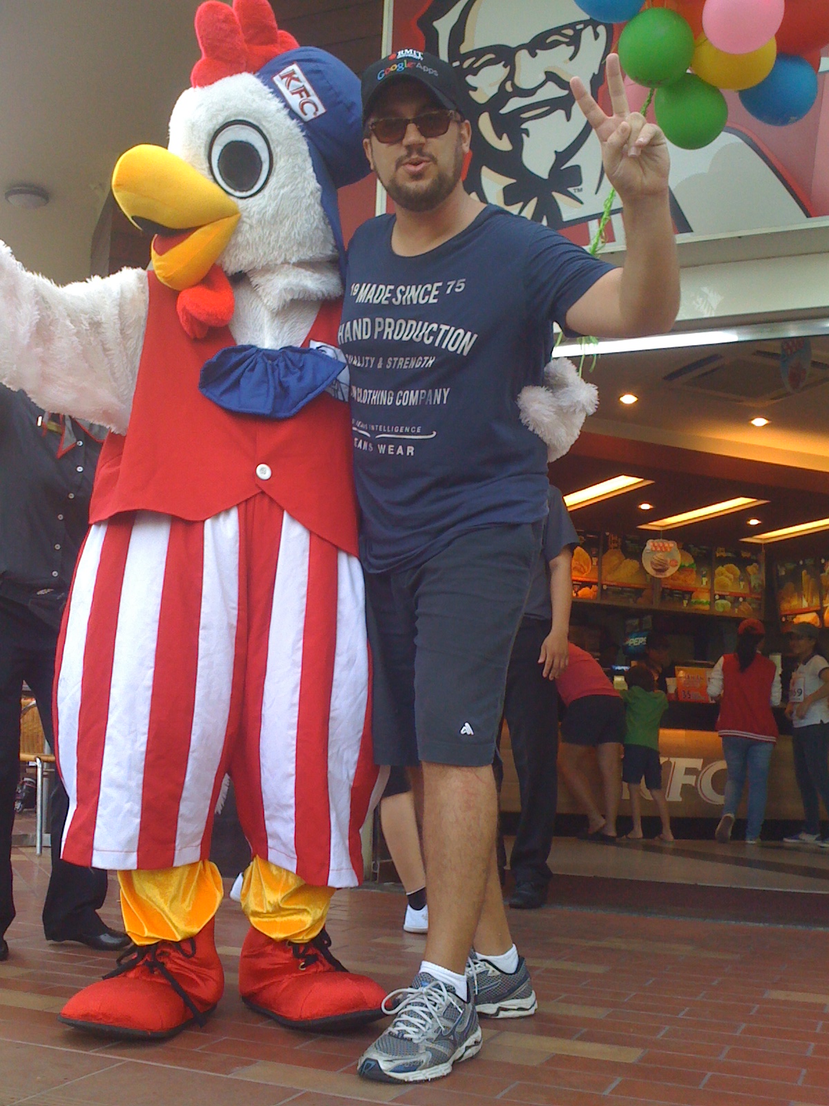 Jacob took this shot of Dad with a giant chicken at KFC during the Run.
