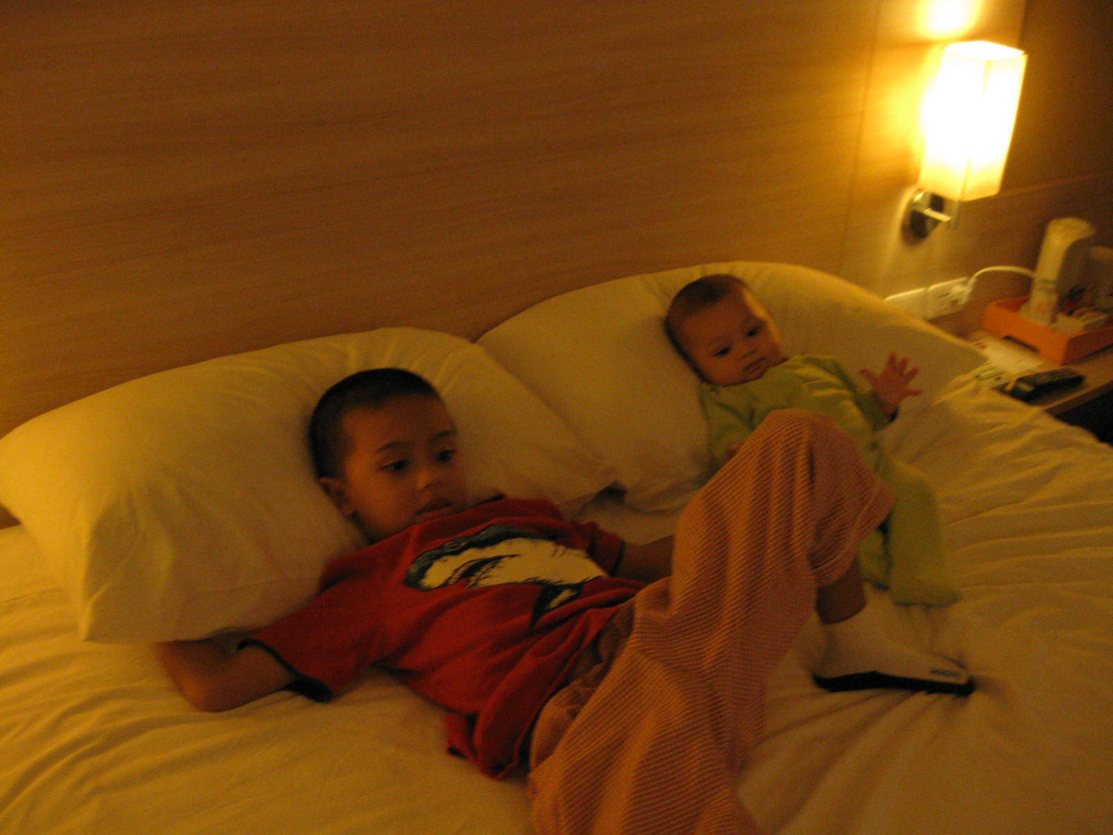 the boys watching cartoon together in bed