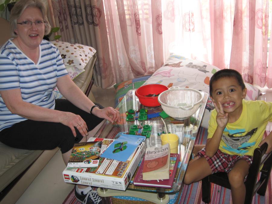 Aunt Karen and Jacob putting together his LEGO boardgame.
