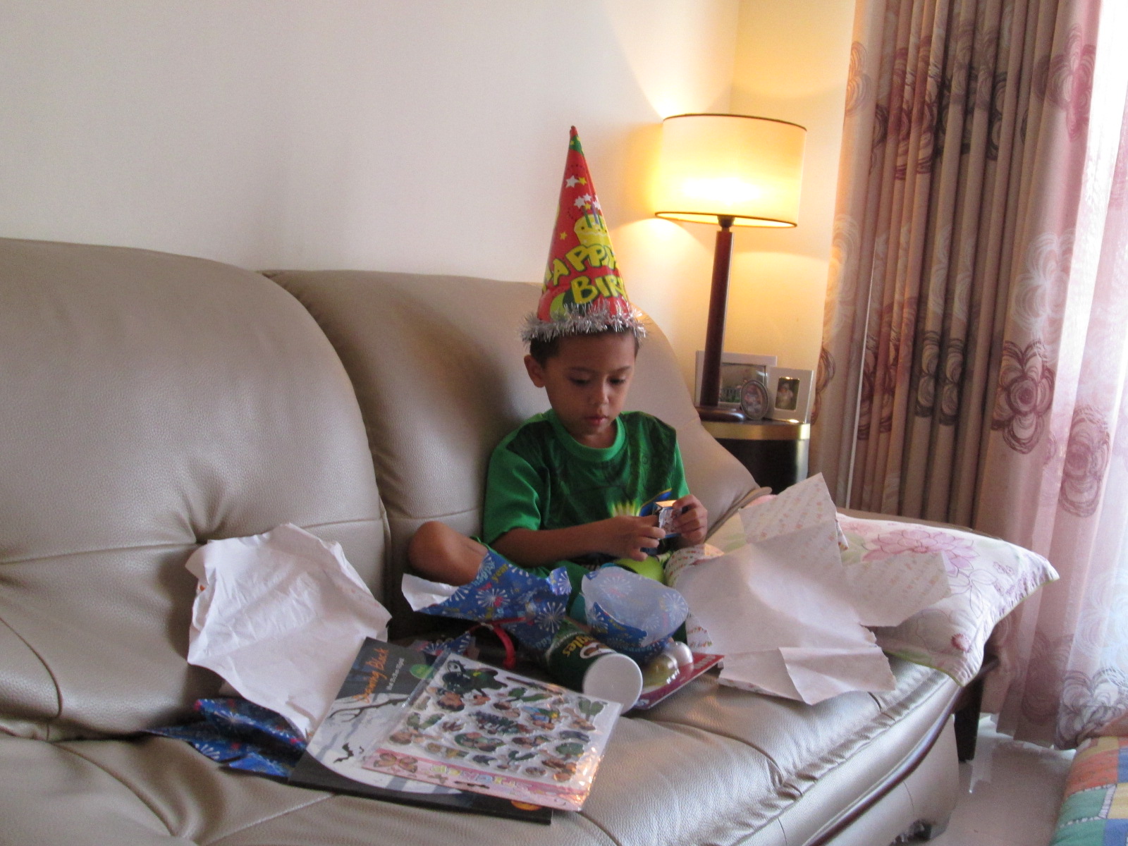Opening gifts from Mom and Dad at home.