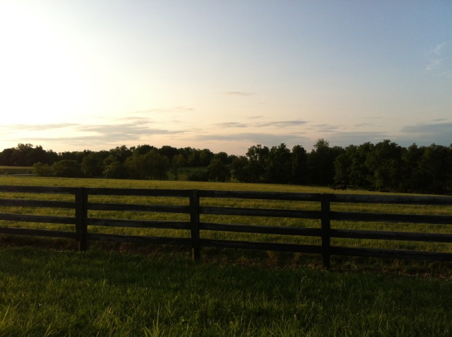Typical Kentucky scene: pastoral landscape with rolling hills and green field wrapped around by either white or black fences.